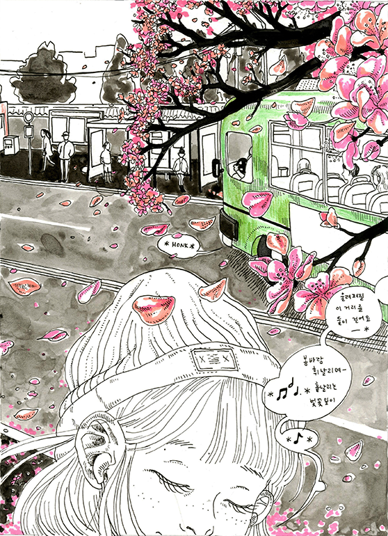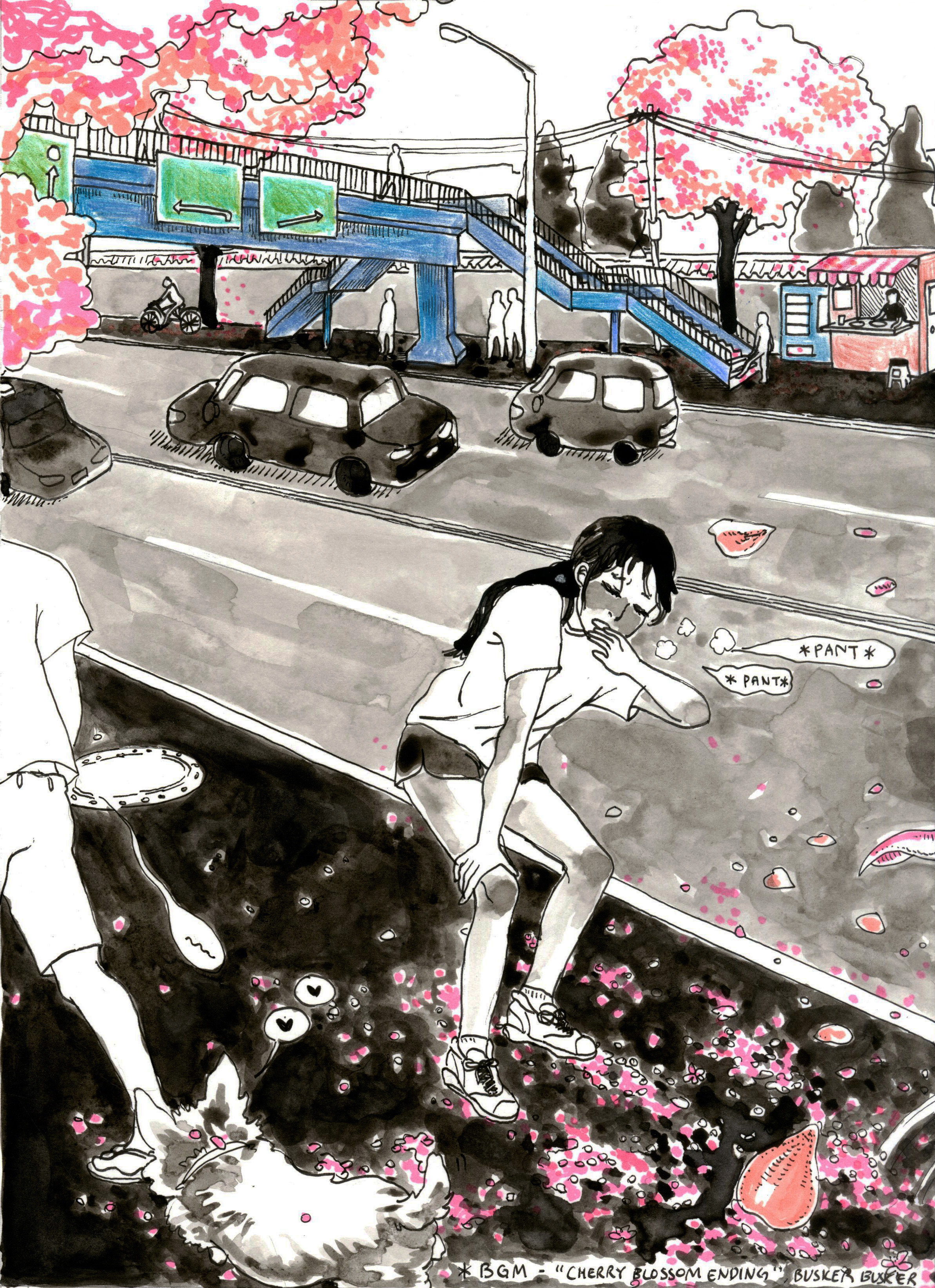My first comic book based on my experience of joing cross country team in highschool. I wanted to remember the feeling of running through the streets in Itaewon with my friends when the cherry blossoms were blooming in the street and the moment when I finally felt the joy of running.